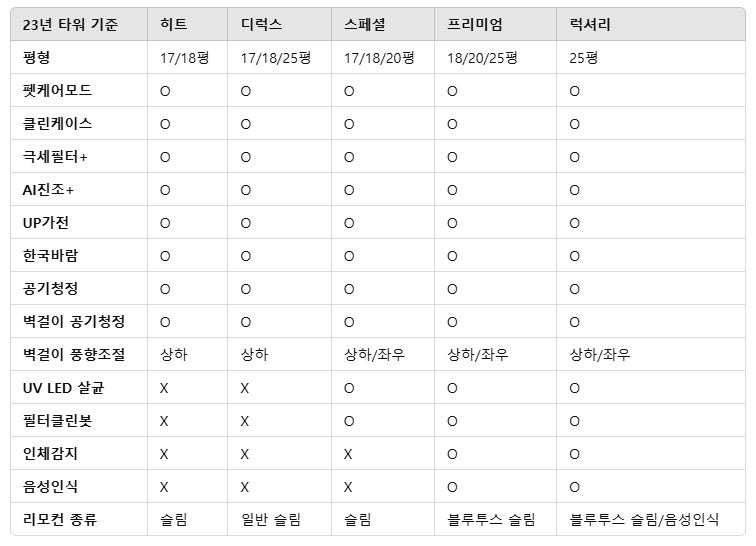 각 등급마다 공기청정, 자동 청소, 센서 기능, 냉방 방식 등이 다르므로, 본인의 필요에 맞는 제품을 선택하는 것이 중요합니다.