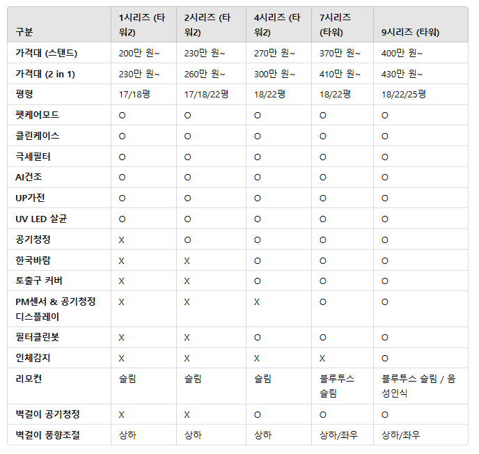 - 7시리즈 (상위 모델, 자동 공기청정 지원): PM 센서 탑재, 필터 클린봇 추가, 블루투스 리모컨 포함